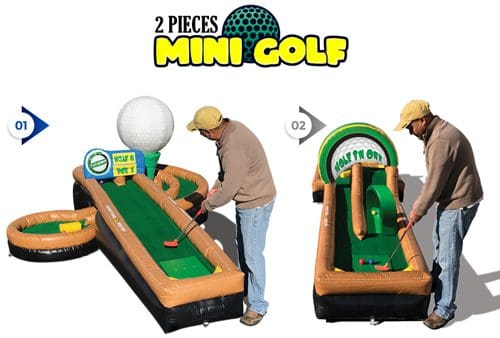 Our Play-A-Round 2 pieces Mini-Golf game from N-flatables features 2 holes of varying designs and levels of difficulty. Great addon for any birthday party, school, church or picnic event.