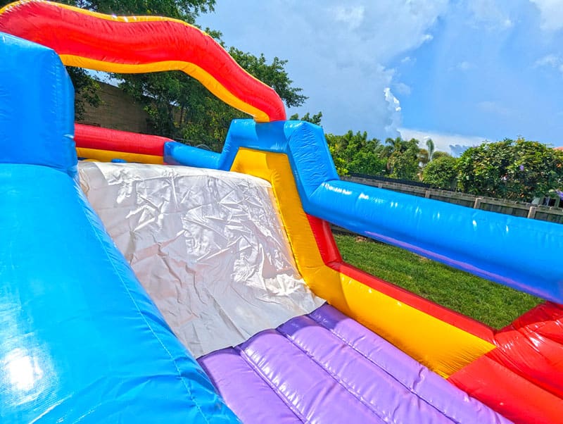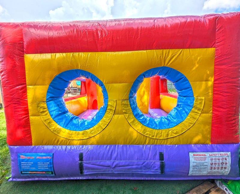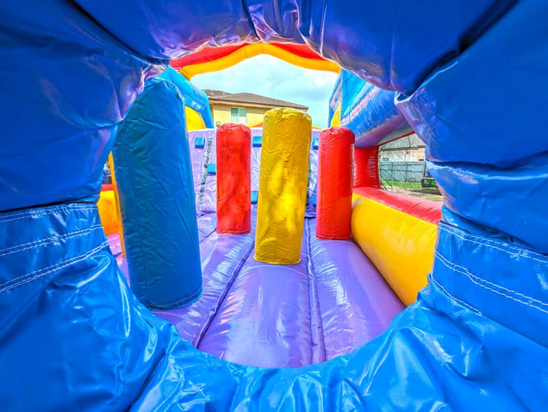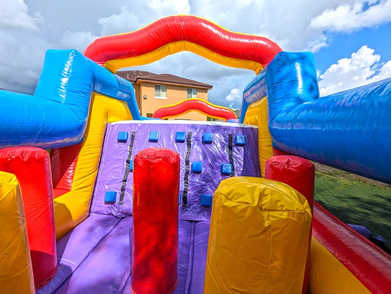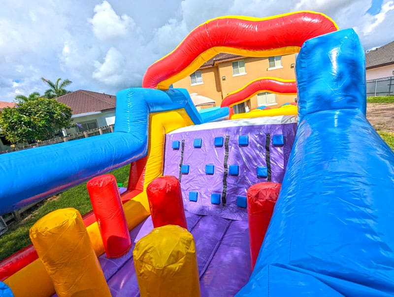 The course features a series of challenging obstacles, including a crawl-through tunnel, a set of vertical pop-ups, a steep climb, and a thrilling slide at the end. The bright and colorful design of the course is sure to catch the eye of anyone passing by, making it a great addition to any outdoor event.