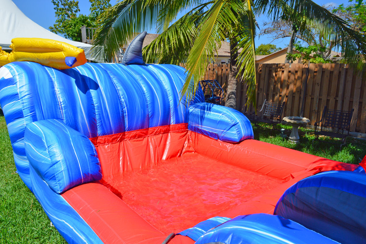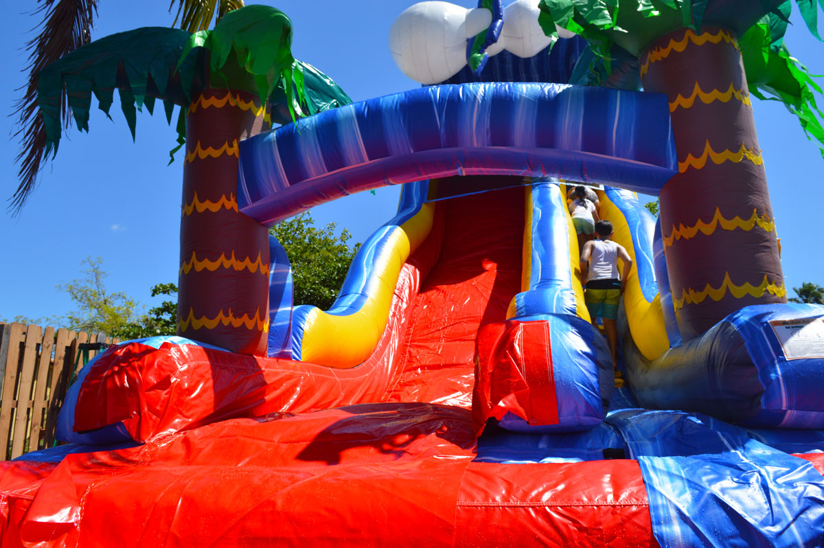 Our 24 ft Wild Waves Waterslide is the perfect slide for thrill seekers. With ocean waves, shark sight, surfboard along with palm trees. Overhead netting provides safety, preventing jumping from top which protects kids on the way down. The whole slide is 48 ft long, 15 ft wide and 24 ft tall.