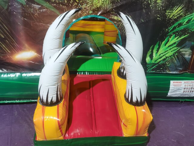 Introducing our Dinosaur Bounce House Combo, the perfect addition to any dinosaur-themed party or event! This inflatable bounce house features a vibrant and colorful design with a large dinosaur on the front, complete with sharp teeth and claws. The Dinosaur Bounce House Combo is not just a bounce house, it also includes a slide and basketball hoop for added entertainment. Kids can bounce around inside the spacious jumping area, climb up the inflatable slide, and shoot some hoops with the attached basketball hoop. Let your little ones embark on a prehistoric adventure with our Dinosaur Bounce House Combo. It will provide hours of fun and entertainment for kids of all ages.
